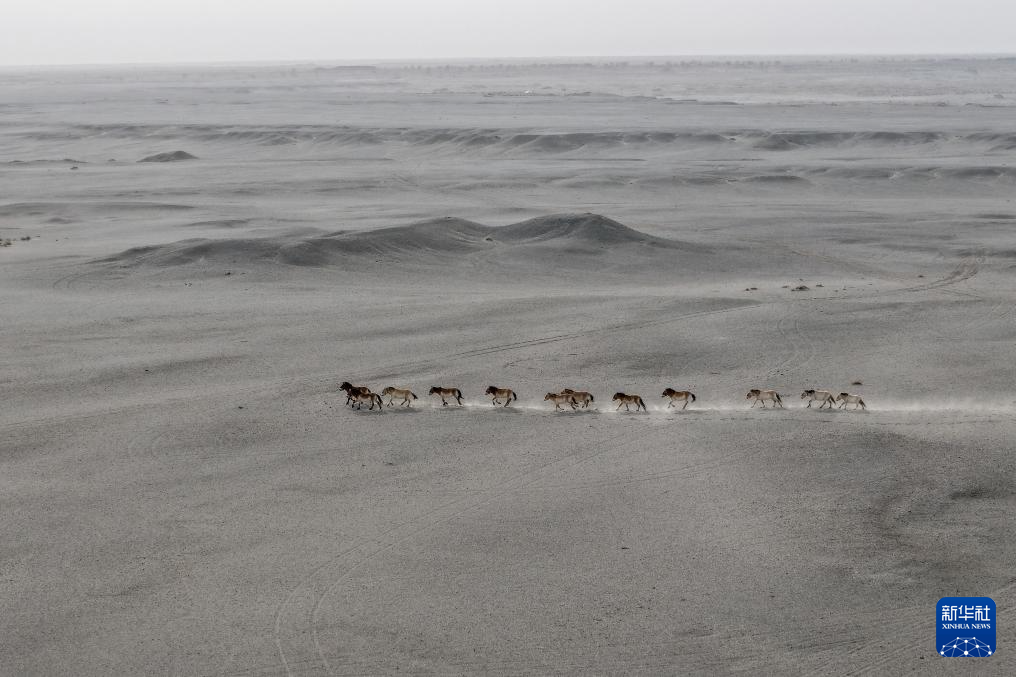 一群普氏野马在甘肃敦煌西湖国家级自然保护区的戈壁荒漠上奔跑(无人机照片)。新华社记者郎兵兵 摄