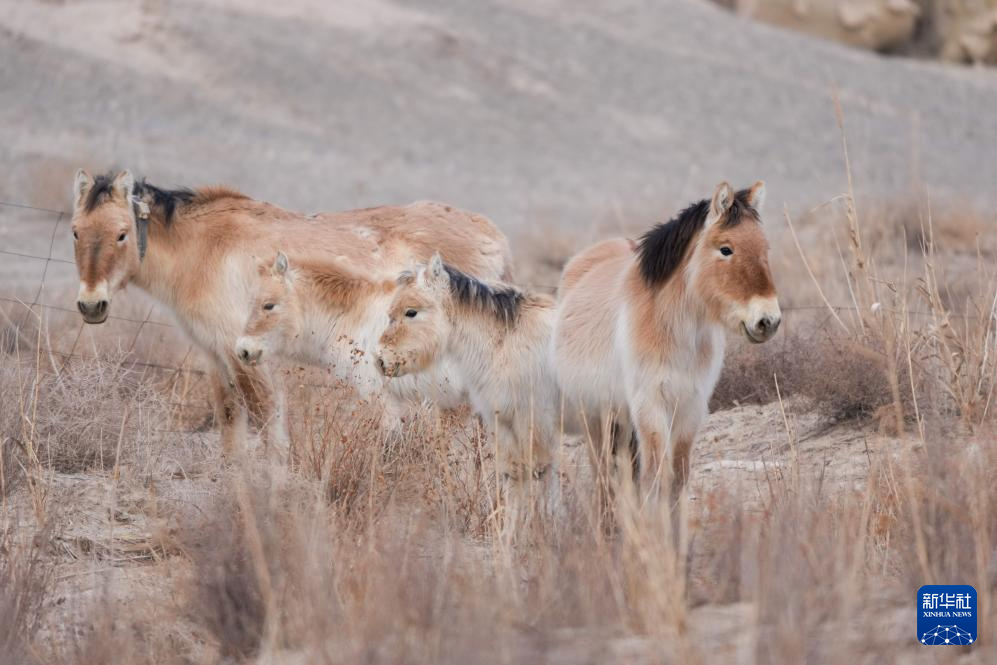 这是在甘肃敦煌西湖国家级自然保护区内拍摄的普氏野马和小马驹。新华社记者郎兵兵 摄