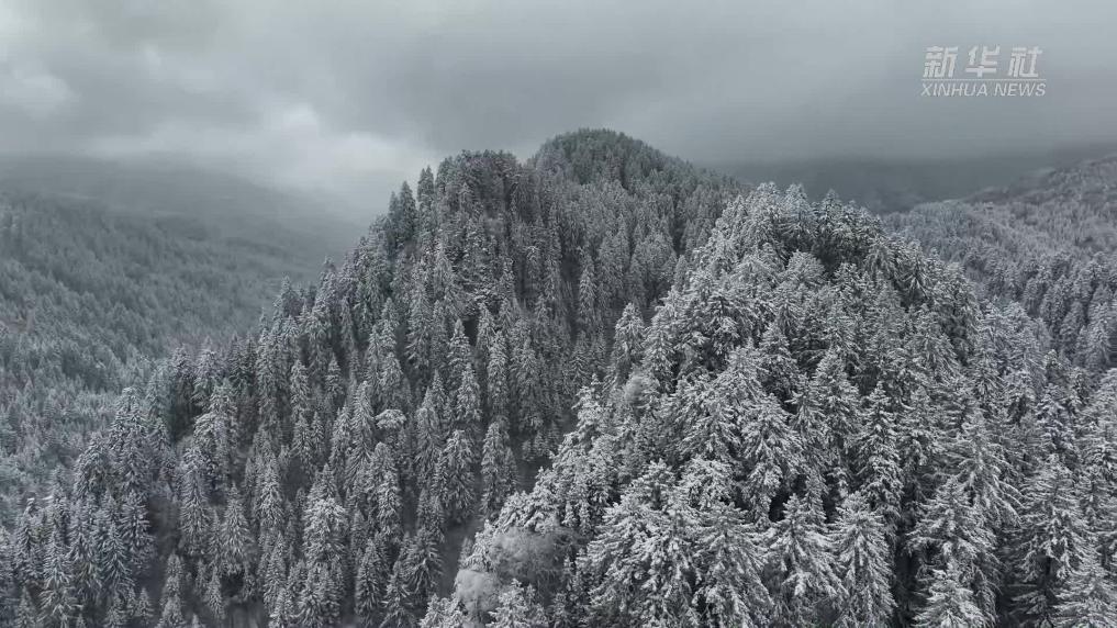 近日,受冷空气影响,甘肃省多个地区出现降温雨雪天气。俯瞰位于黄土高原的山区,莽莽林海被白雪覆盖,宛若仙境。密林、古塔、溪流交织成画,在静谧中呈现别样春景。